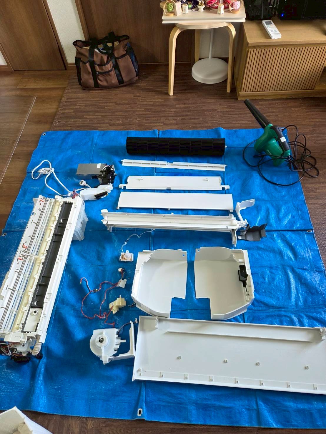 完全分解:エアコン本体を壁から取り外し、ドレンパン・ファン・熱交換器をユニットごとバラして丸洗いする。